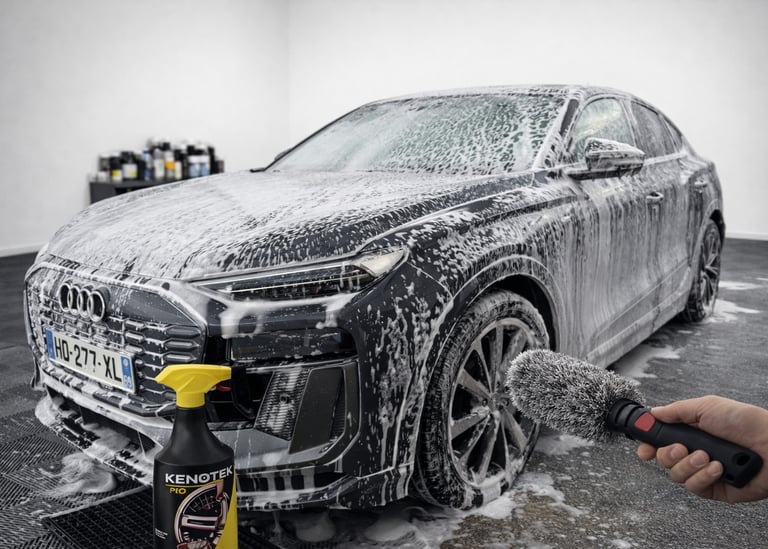 Notre rituel extérieur débute par un nettoyage soigné des jantes traitées avec le décontaminant ferreux de notre partenaire KENOTEK pour dissoudre la poussière de frein.